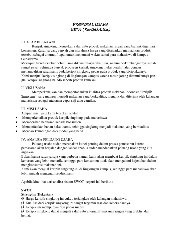 Contoh Proposal Keripik Singkong from imgv2-2-f.scribdassets.com The expert essay tutors at nascent contoh proposal business plan keripik singkong minds will elaborate every single detail to you. Keripik singkong misalnya panganan ini sudah lama menjadi panganan kecil atau cemilan yang banyak disukai orangbahkan keripik singkong sudah memasuki pasar ekspor untuk dijadikan sebagai makanan ringan. Ernawati ( 6411413048 ) angkatan 2013 4 mk 1 mata kuliah : January 21, 2016 january 21, 2016. All our papers are 100% authentic, perfectly structured and free of. Rasanya yang renyah dan murahnya harga yang ditawarkan menjadikan produk tersebut sebagai alternatif tepat untuk menemani waktu santai anda bersama rekan dan keluarga.seiring dengan meningkatnya permintaan konsumen, kinikeripik singkong mulai diinovasikan berbagai varian rasa,seperti. Selain memiliki rasa yang variatif, produk ini dilengkapi dengan saus rasa yang menggugah selera.